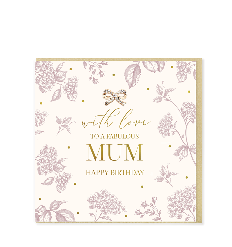 A luxurious greetings card with gold foil detailing. Hand embellished with a diamanté and gold bow jewel. Printed on high quality FSC card and presented with a gold envelope. Cello wrapped. Blank inside.