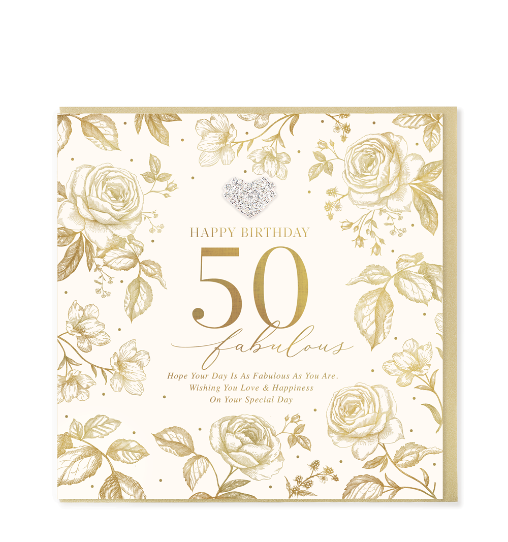 A beautiful large sized greetings card with gold foil sentiment. Hand embellished with a large diamanté heart jewel. This card is printed on luxury FSC board and presented with a luxurious gold envelope. Cello wrapped. Blank inside.