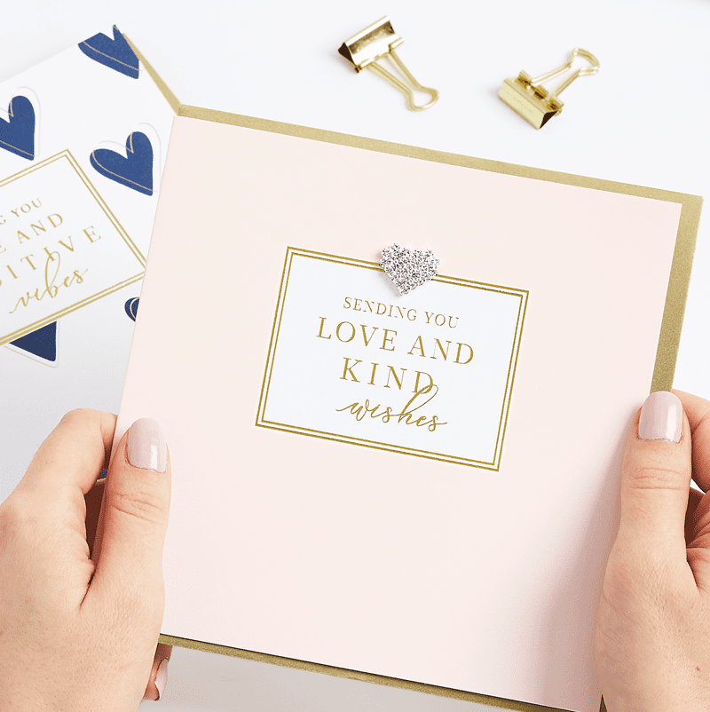 Our gorgeous luxury greetings card with Gold foil sentiment and hand embellished with a diamanté heart jewel. This card is printed on luxury FSC board and presented with a pearlescent Gold envelope and cello wrapped. Blank inside.